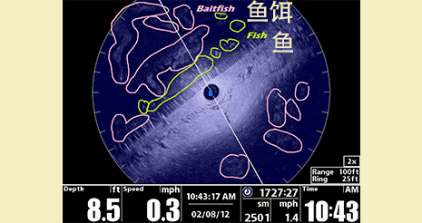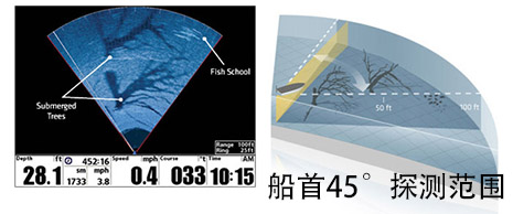 有了Humminbird 360°鱼探仪,就可以在船舶抵达鱼群产生骚扰之前就首先发现鱼群。同时对于船舶为中心的前后左右均实时发现水下的所有目标与结构。此功能可以直接替代前向扫描式声纳设备的功能。