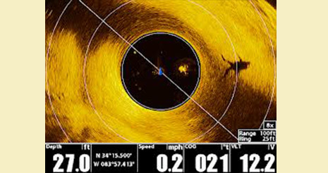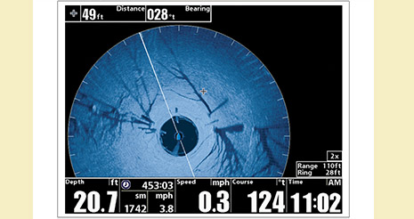Humminbird 360°的SwitchFire功能可以支持分屏显示,将360°水下成像画面与GPS导航海图画面并排显示。这样用户就可以根据水下图像的情况,直接在海图画面进行航路点的标注,然后方便地直接驾驶船舶回到希望要找的水下目标位置的区域。