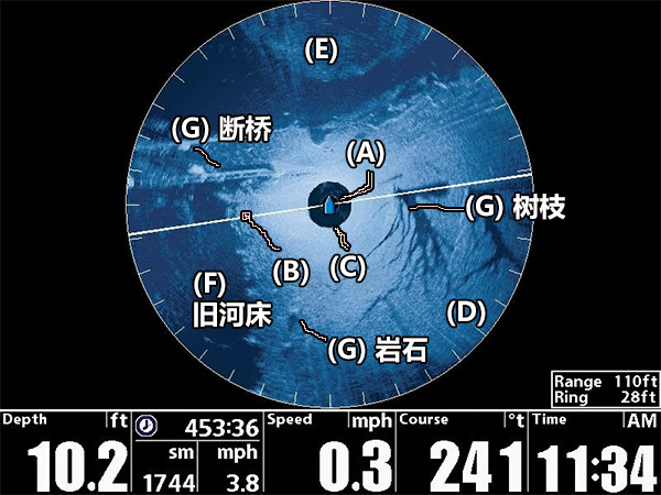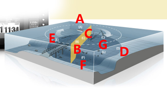独特的Humminbird 360°全向水下成像,提供了全方位探测观察水下地形结构与目标的直观画面。这种类似雷达工作的表现形式,具体该如何理解与根据屏幕画面图像进行水下情况分析判断呢?