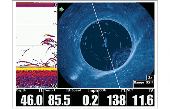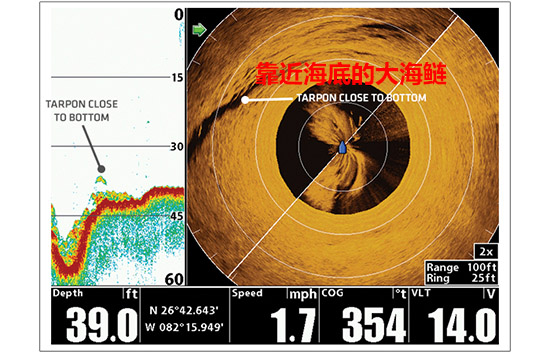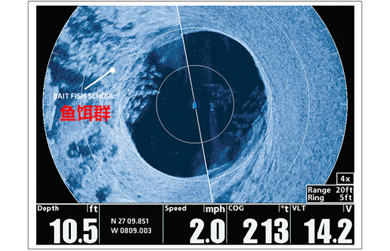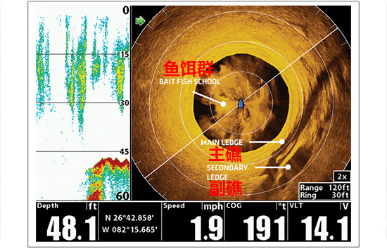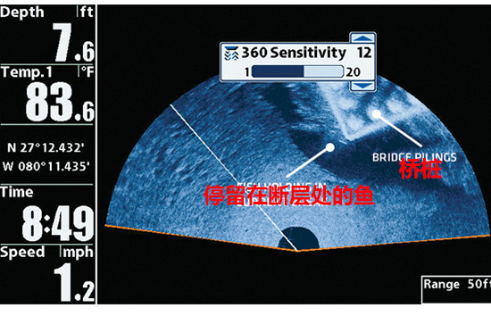 简单地想像,将Humminbird 360理解为本船左右舷在水下有一面很薄的150ft(大约为45米)的声纳墙在以本船为中心进行转动,进而形成了一面直径为90米的声纳墙不停地扫描水下。